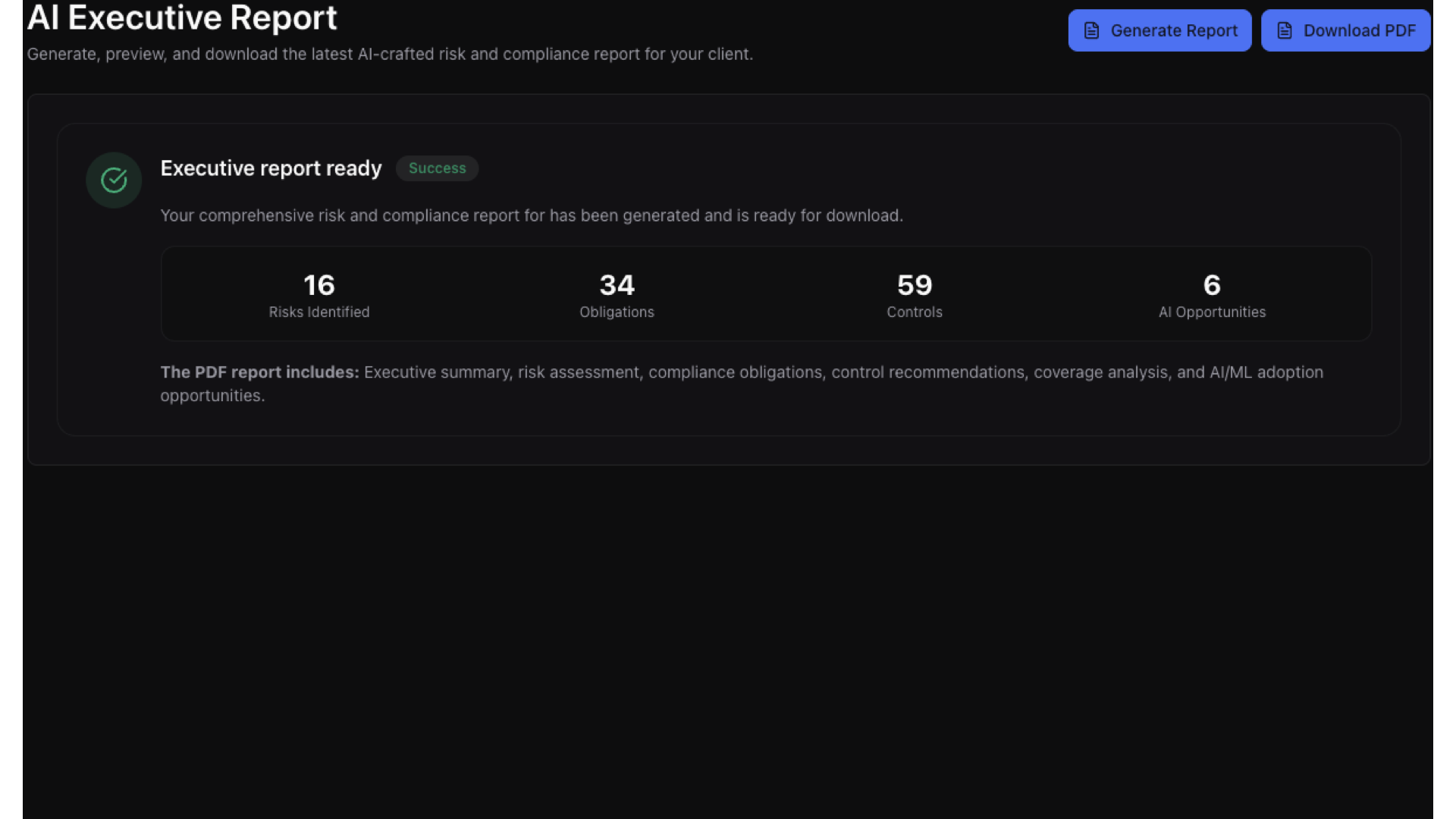 Executive summaries, obligations maps, and control coverage snapshots ready for your board pack.