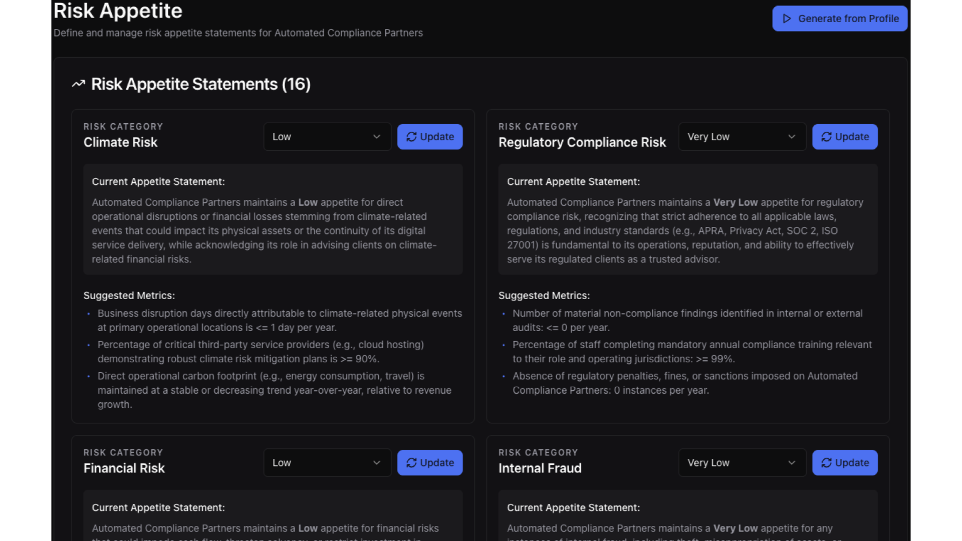 Comprehensive session to set risk appetite levels and determine inherent risk impacts.